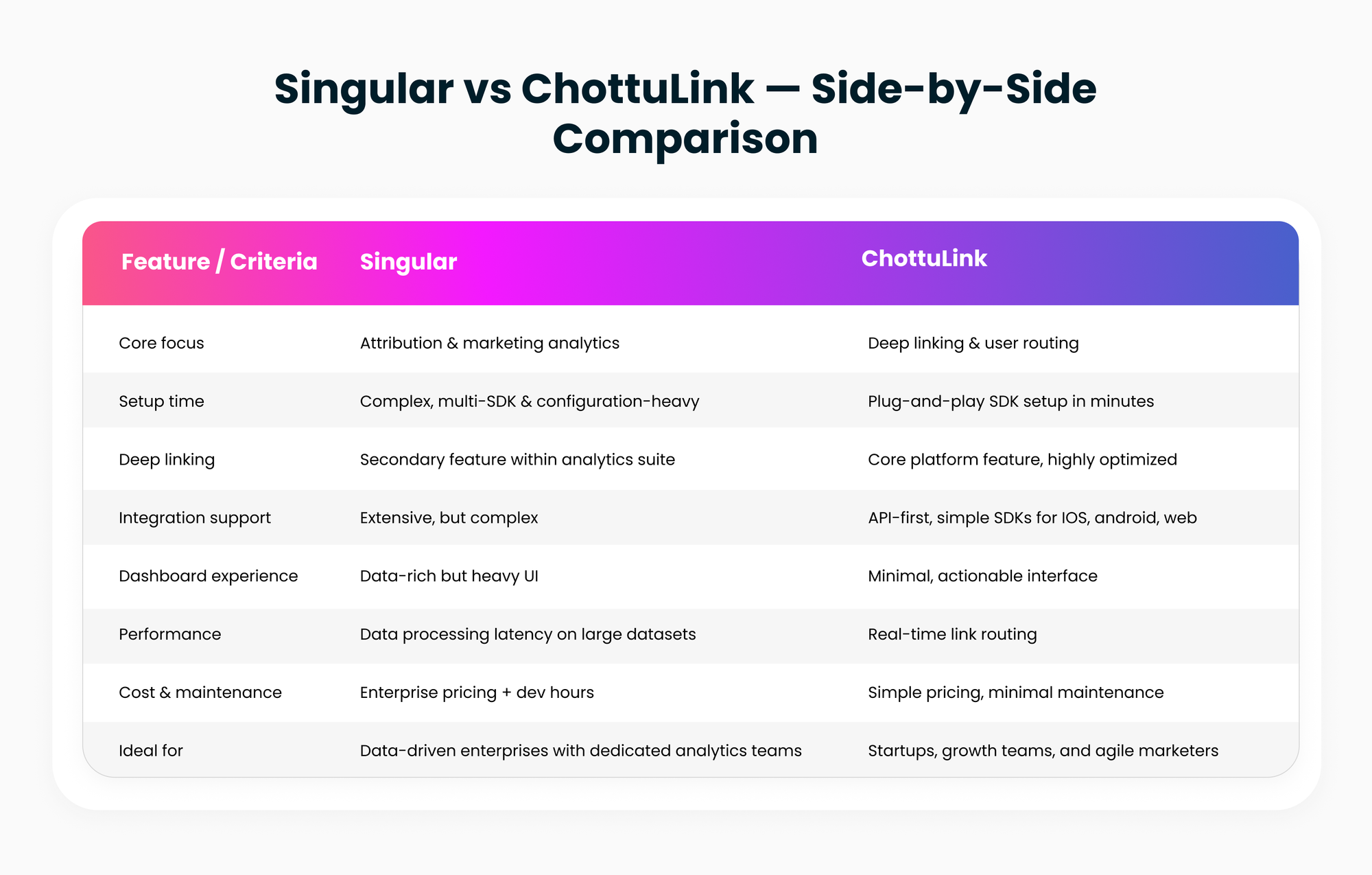 Where Singular excels in data analytics and reporting for large-scale marketing teams, ChottuLink focuses on execution speed, lightweight architecture, and developer efficiency — perfect for startups, mobile growth teams, and modern apps scaling fast.